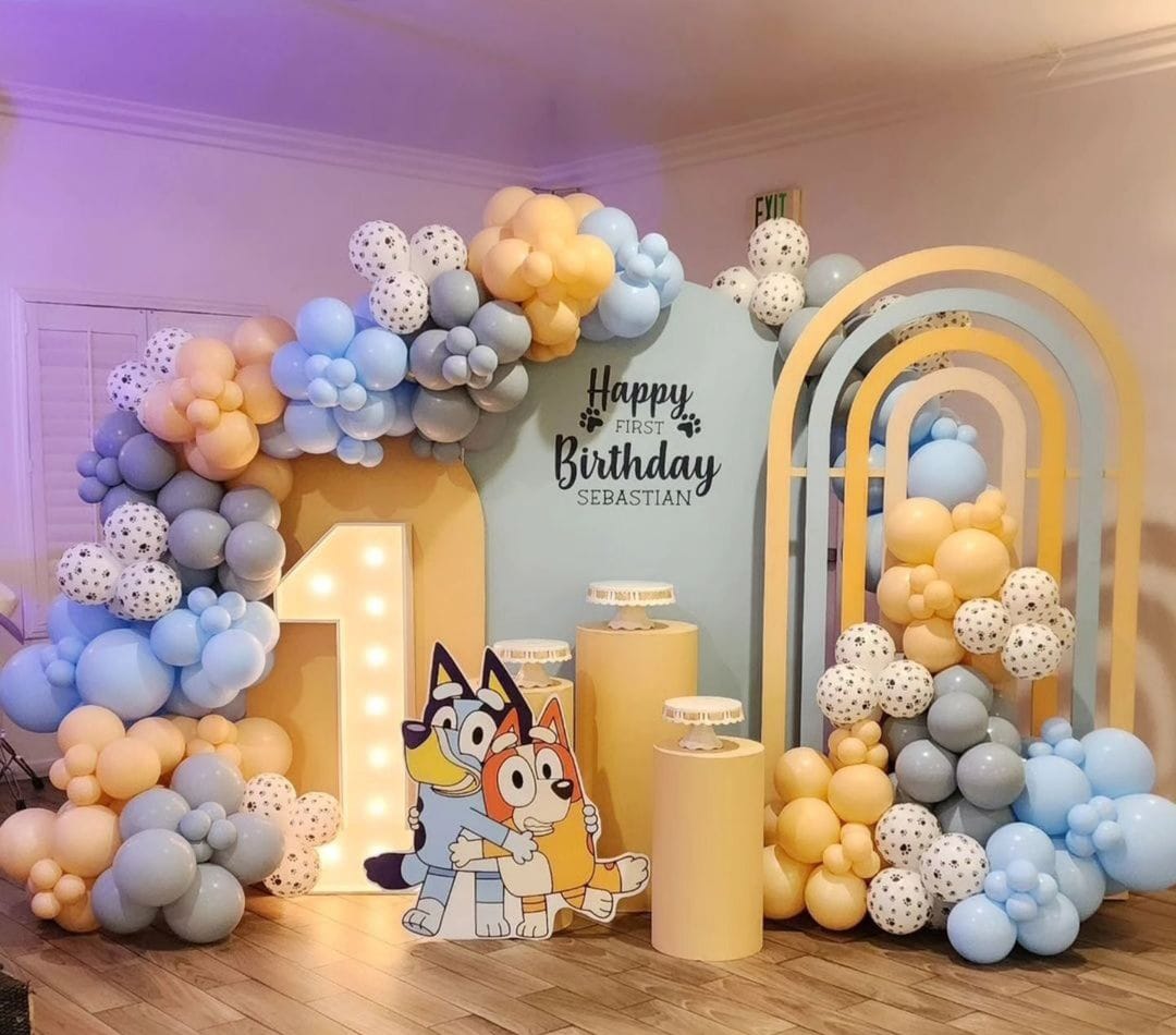 Custom “Bluey Theme” Balloon Decoration in Baby Blue, Yellow & Grey
